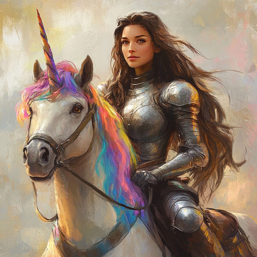 Para el unicornio, utiliza un blanco perla como base, añadiendo sombras suaves en tonos gris claro o azul pálido para dar volumen y resaltar su figura. La melena y la cola del unicornio pueden ser coloreadas con un efecto arcoíris o tonos pastel como rosa, lila, azul y amarillo para aportar un toque mágico y vibrante. El cuerno puede destacarse con un dorado o plateado con detalles brillantes para resaltar su naturaleza mística.