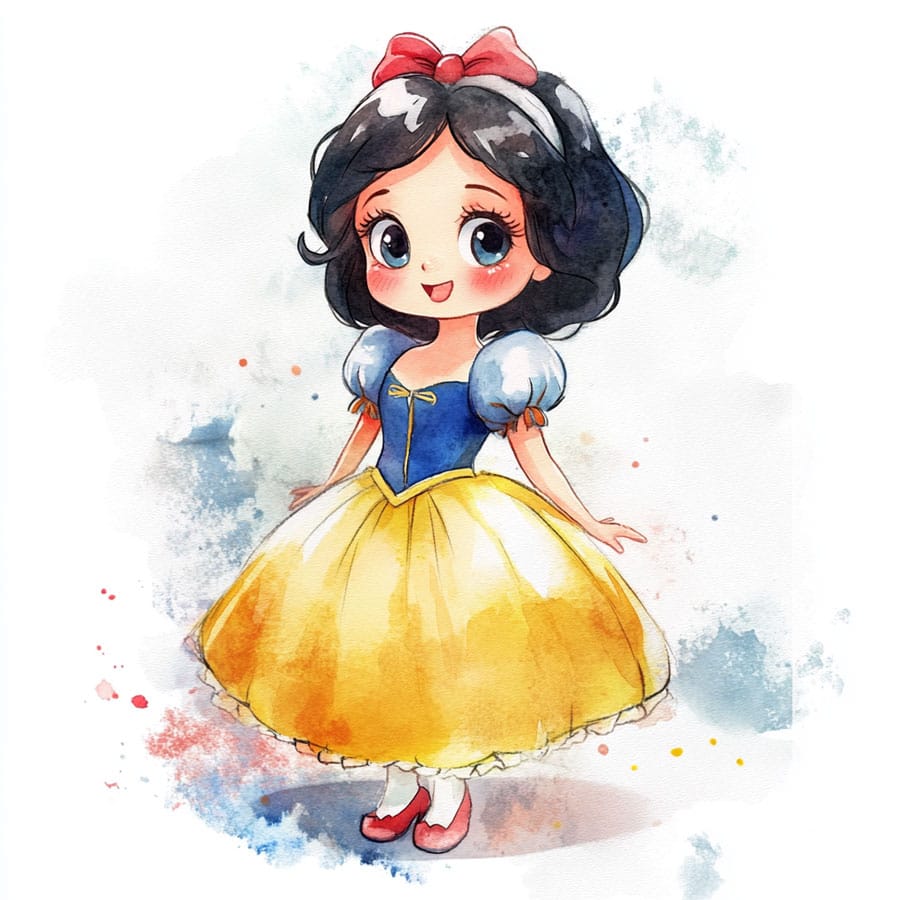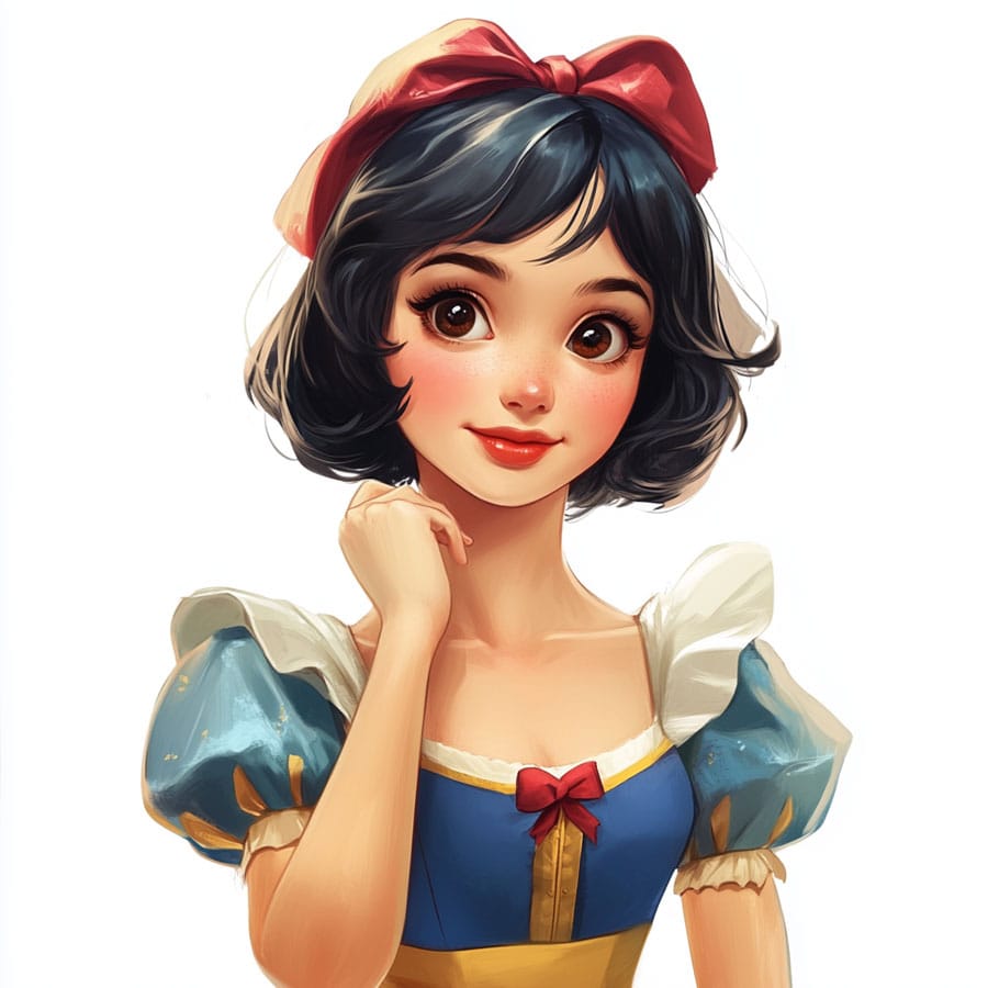 • Vestido: El vestido clásico de Blancanieves combina azul, rojo y amarillo. Usa un azul vibrante para el cuerpo del vestido y mangas, rojo para los detalles (como los globos de las mangas) y amarillo suave para la falda. Para los pliegues, presiona un poco más con el lápiz en las zonas cercanas a los bordes o donde se doblan las telas.
