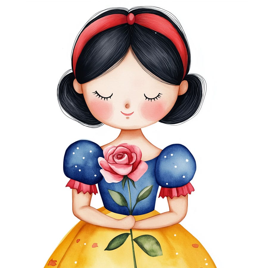 ¿Recordáis a Blancanieves? Es una princesa muy dulce y buena que vive muchas aventuras en un bosque lleno de magia. Hoy la tenemos aquí, sentada entre flores preciosas con un ramo en sus manos. ¿Os imagináis darle vida con vuestros colores favoritos?