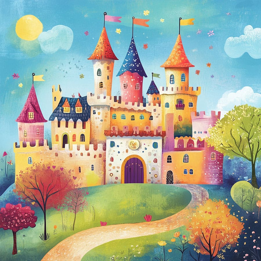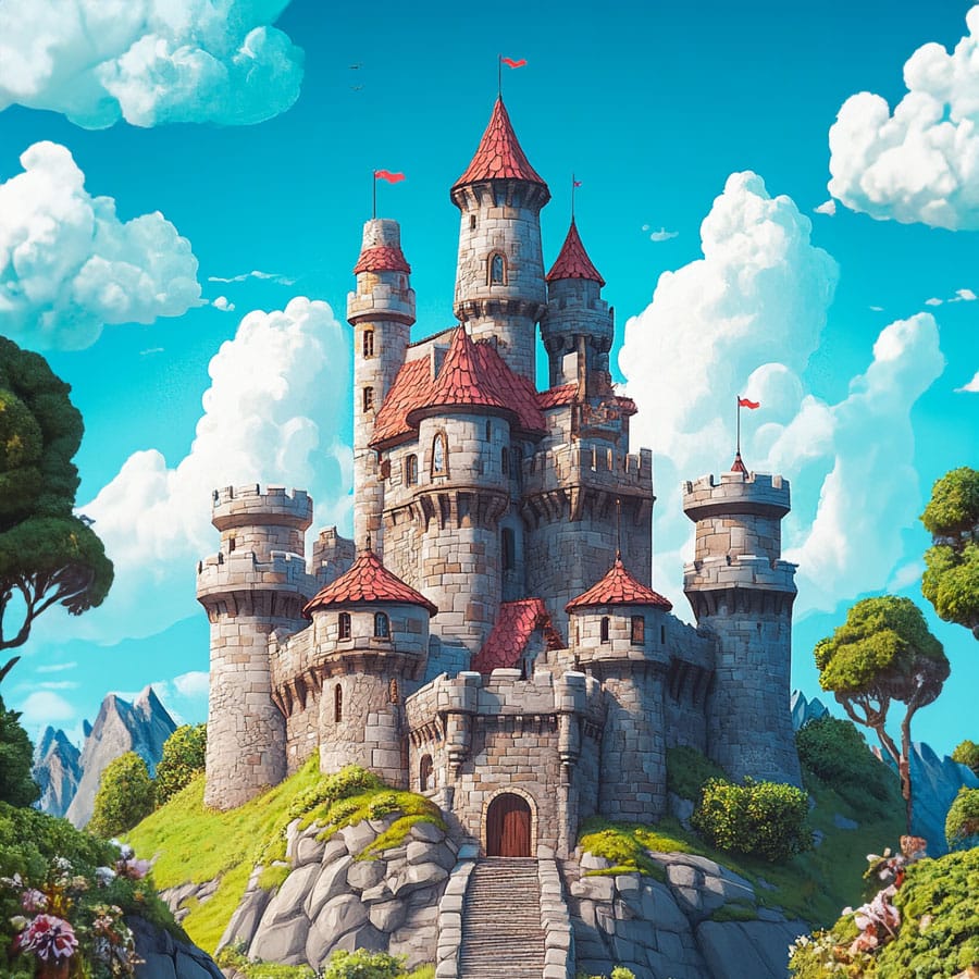 El castillo al fondo puede ser coloreado en tonos de piedra gris o beige, pero no dudes en agregar algunos detalles en colores más vivos para los techos o las banderas. Las colinas y el paisaje alrededor pueden tomar tonos verdes y marrones, creando un contraste natural que da vida al escenario medieval.