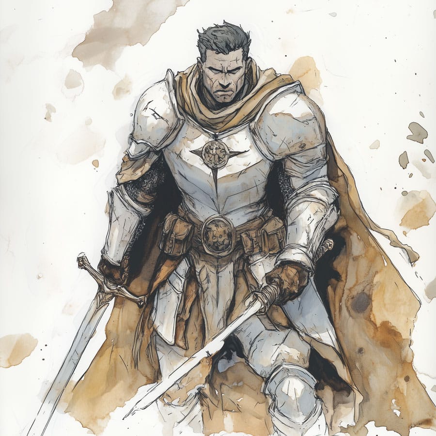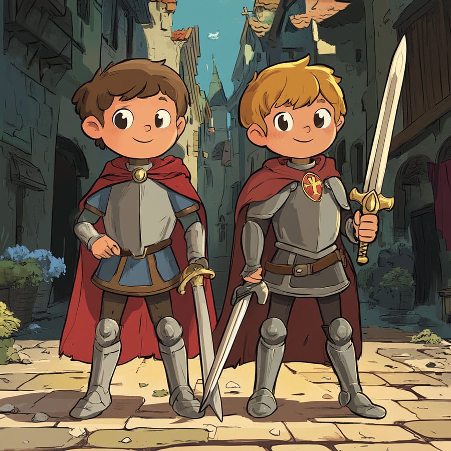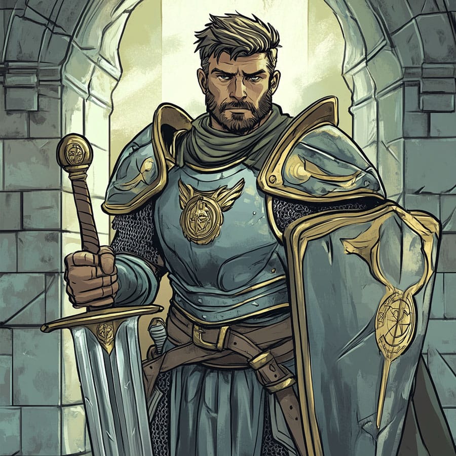 Los detalles como la espada y el escudo pueden destacarse con colores metálicos, pero si quieres añadir un toque de fantasía, podrías usar tonos azules o verdes brillantes para sugerir que tienen poderes mágicos, un guiño a las leyendas artúricas.
