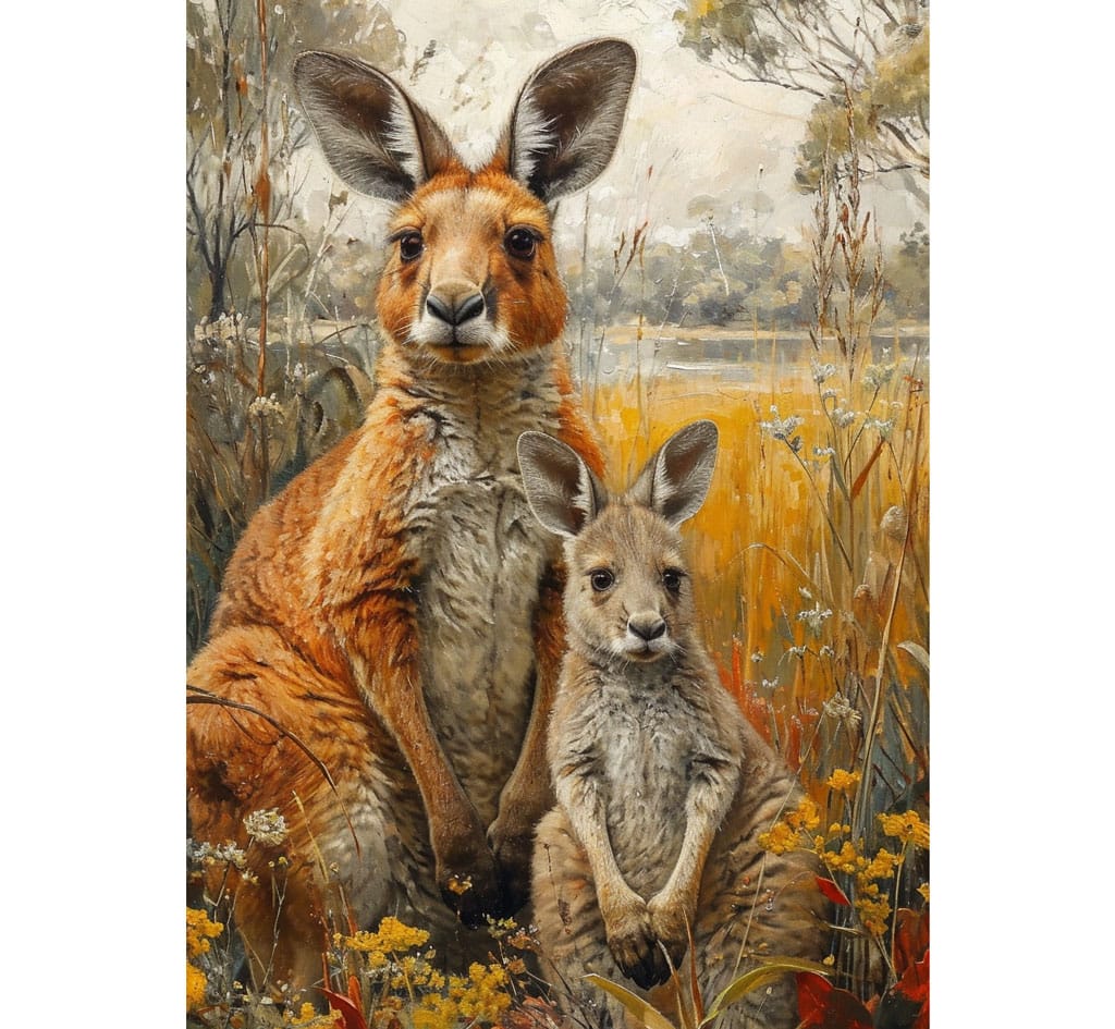 - Cuidado maternal: Las madres canguro pueden tener tres joeys al mismo tiempo en diferentes etapas de desarrollo: uno fuera de la bolsa, otro en desarrollo dentro de la bolsa, y un embrión en espera.