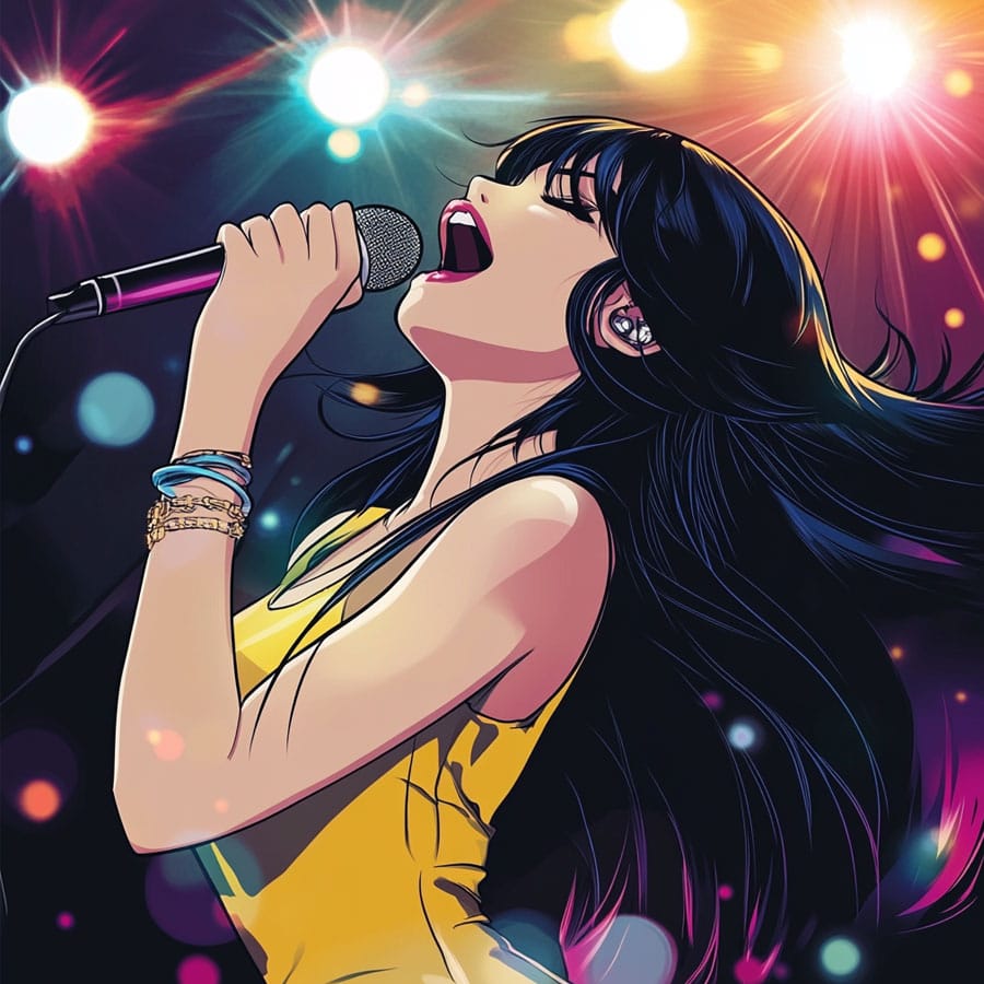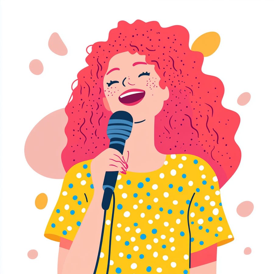 Cuenta una historia a través del color. Imagina la canción que está interpretando esta joven artista y elige una paleta de colores que refleje su género musical y su estado de ánimo. ¿Es una balada emotiva o un tema lleno de energía? Los colores que elijas para su vestuario, el micrófono y los elementos de fondo te ayudarán a transmitir la atmósfera de la canción.