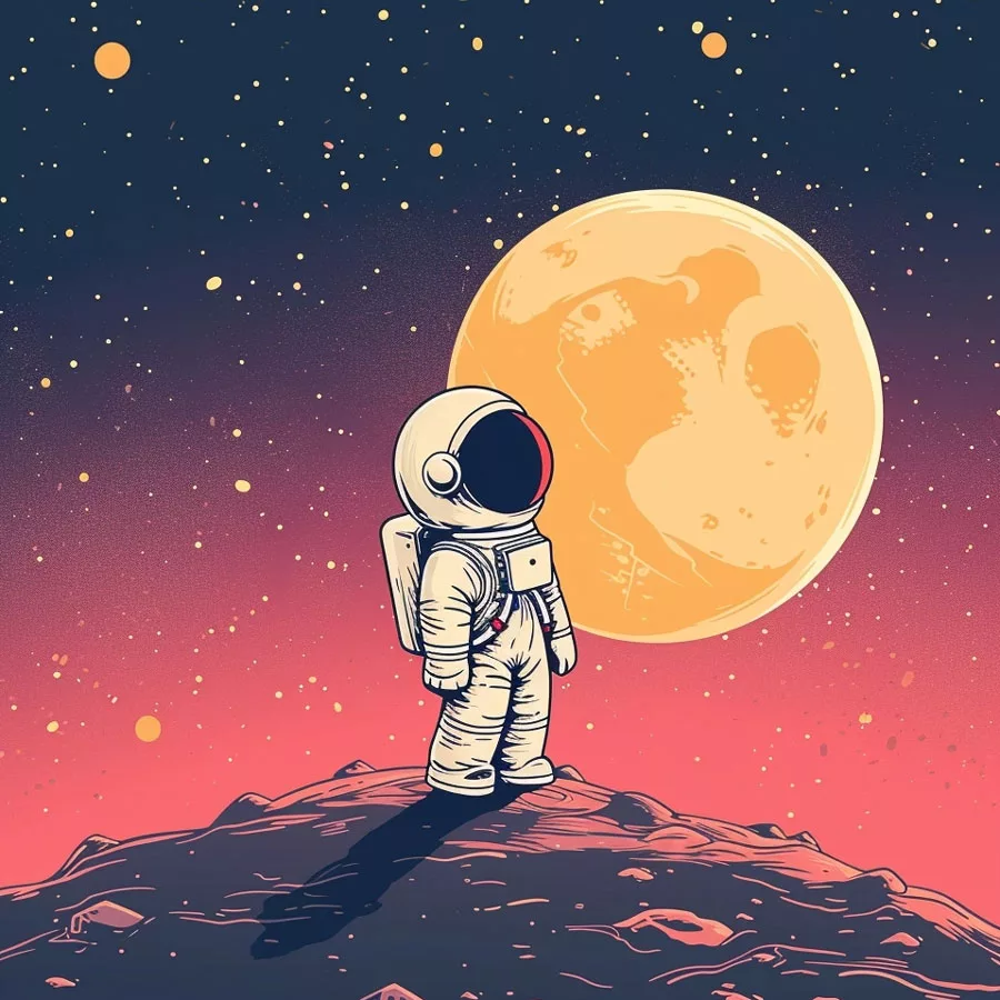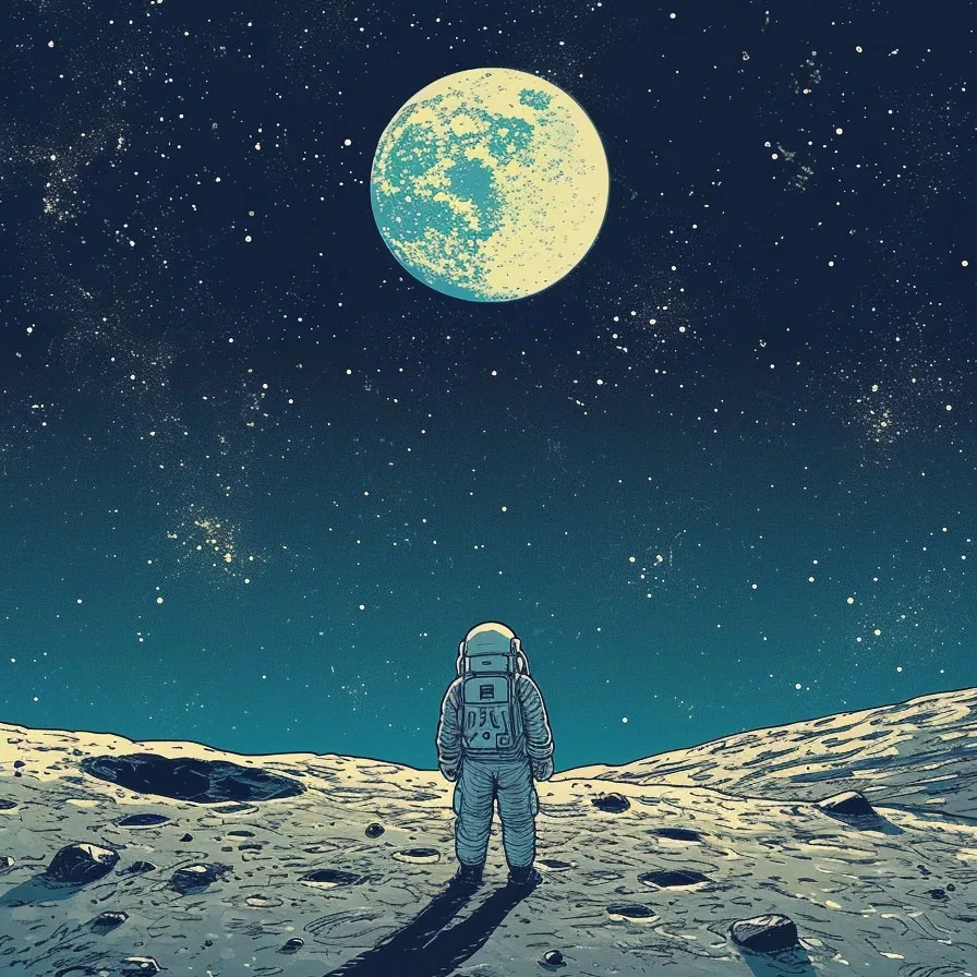 Este dibujo puede parecer sencillo, pero tiene muchos retos interesantes al colorear. El entorno lunar o planetario es monocromático: tonos grises, pálidos, sin muchos colores vivos. Por eso, el artista tiene la oportunidad de inventar atmósferas: un cielo verdoso, una arena morada, luces azules reflejadas por un sol diferente.