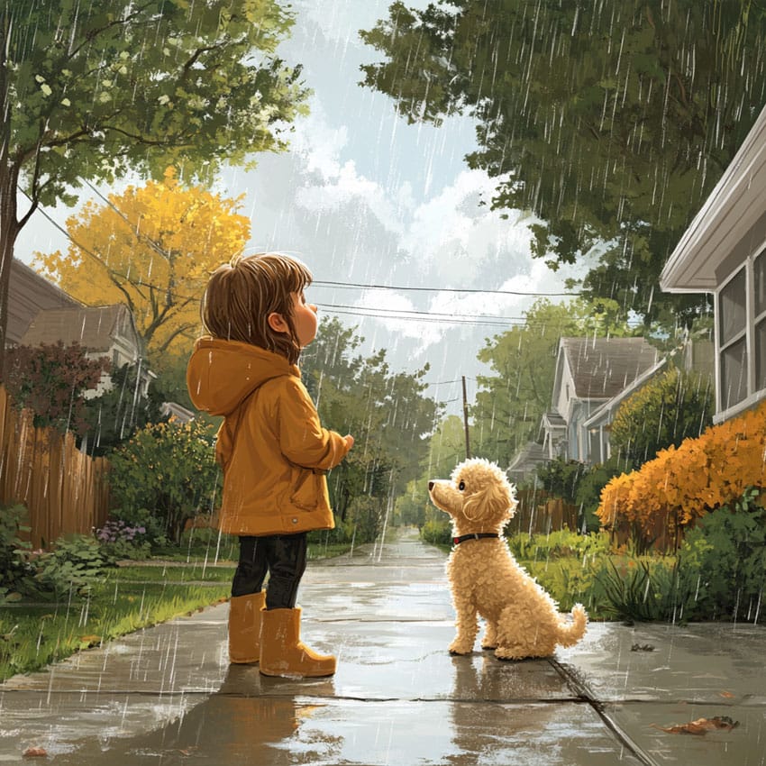 4. La lluvia y las gotas: Aunque la lluvia generalmente es transparente, puedes darle un efecto más interesante con tonos suaves de gris o azul claro. Colorea las gotas en degradados suaves para que parezcan ligeras y en movimiento. Las pequeñas salpicaduras en el suelo pueden resaltarse con tonos más oscuros para dar una sensación de profundidad.