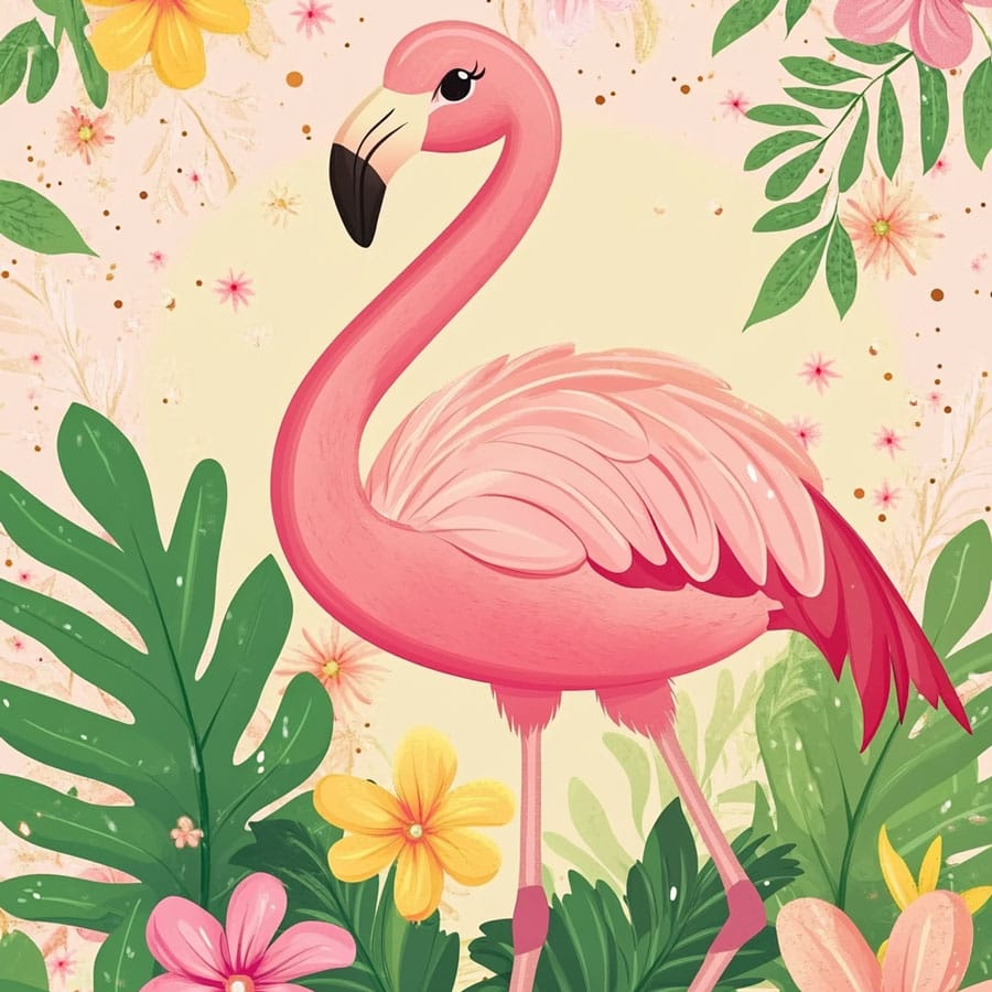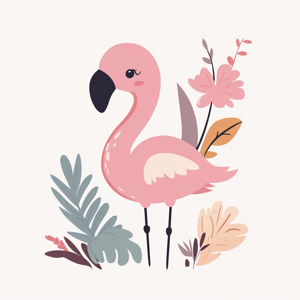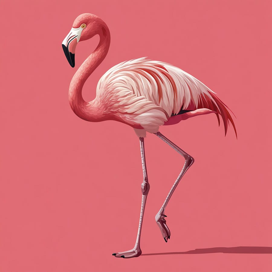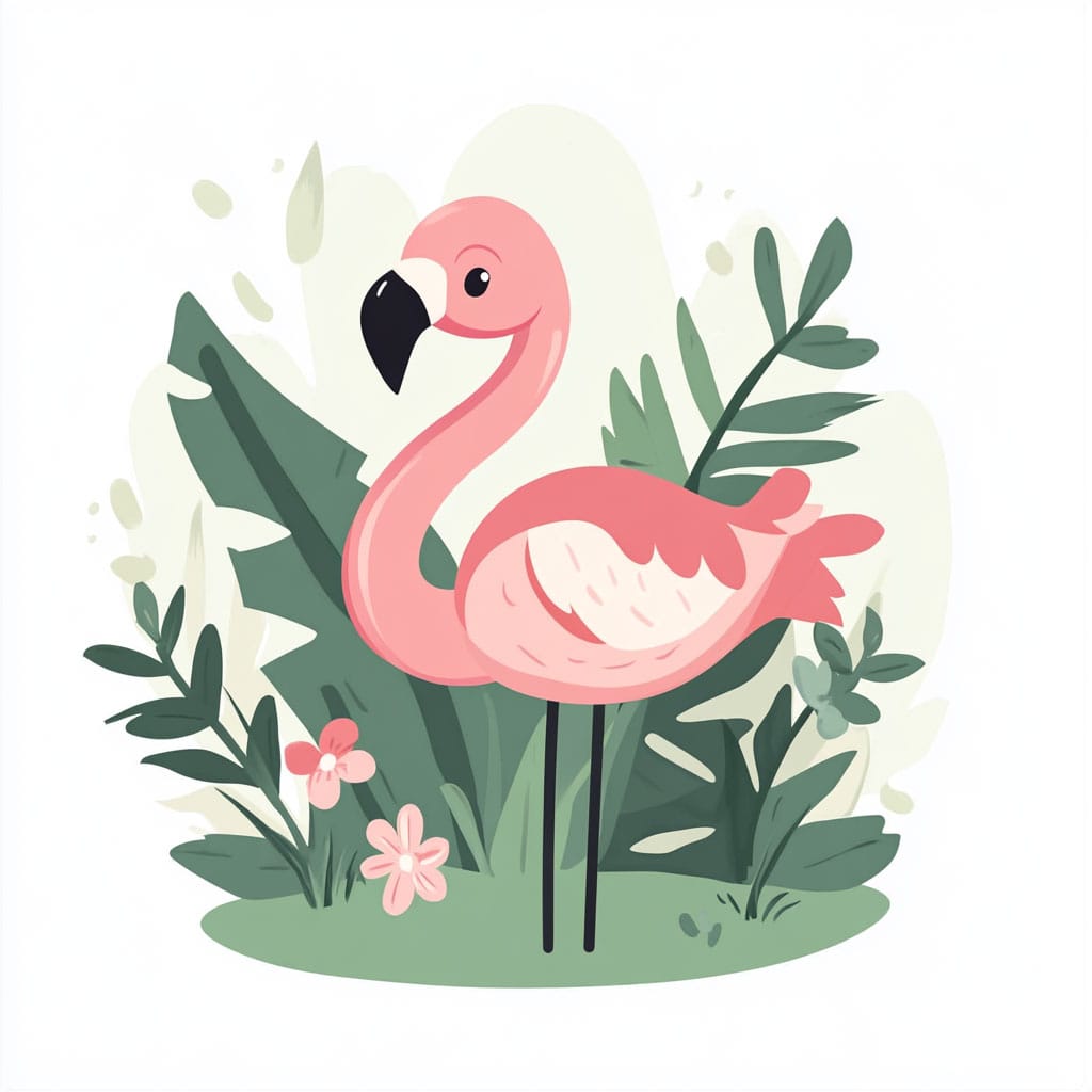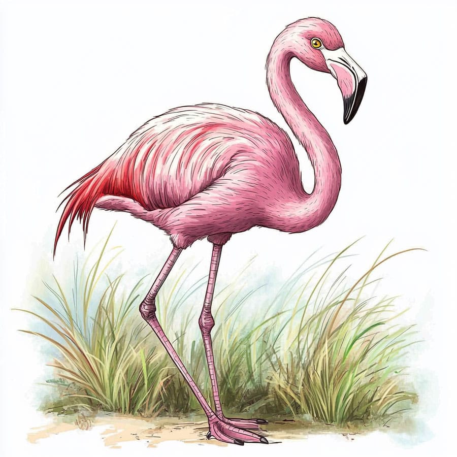 Observa detenidamente la imagen. ¿Qué ves? ¡Un flamenco! Esta elegante ave se encuentra en zonas húmedas, como lagos y lagunas. El dibujo muestra al flamenco de pie, con sus largas patas y su cuello curvado en forma de «S». Alrededor, puedes ver plantas acuáticas y un pequeño cuerpo de agua.