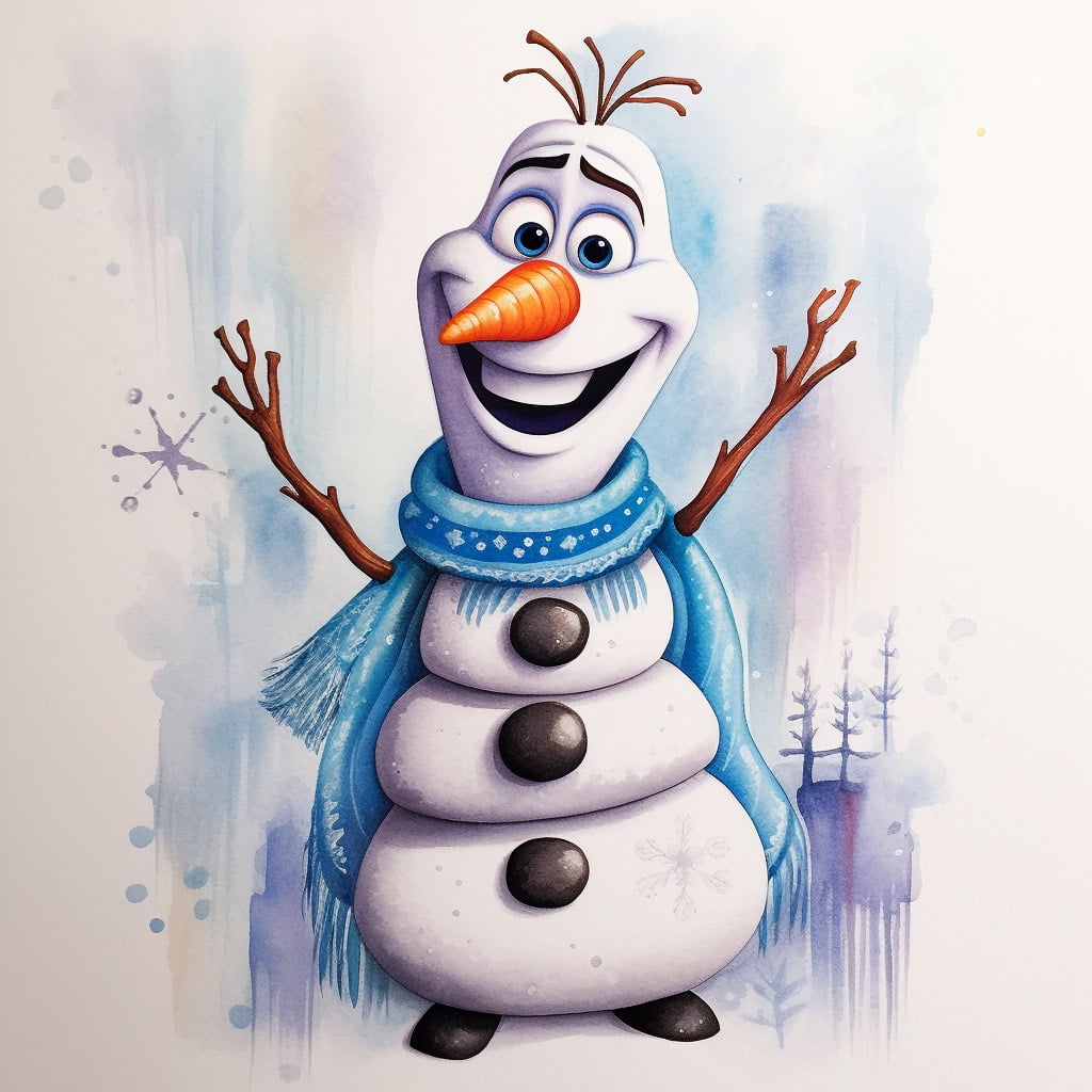 Olaf: Olaf es un muñeco de nieve muy simpático y gracioso que ama los abrazos calientes. Como es de nieve, deja su cuerpo en blanco, pero puedes usar un poco de azul claro para darle sombras y que parezca más real. Su nariz es una zanahoria, así que debe ser naranja. Y no te olvides de darle vida a sus ojos y boca con negro.