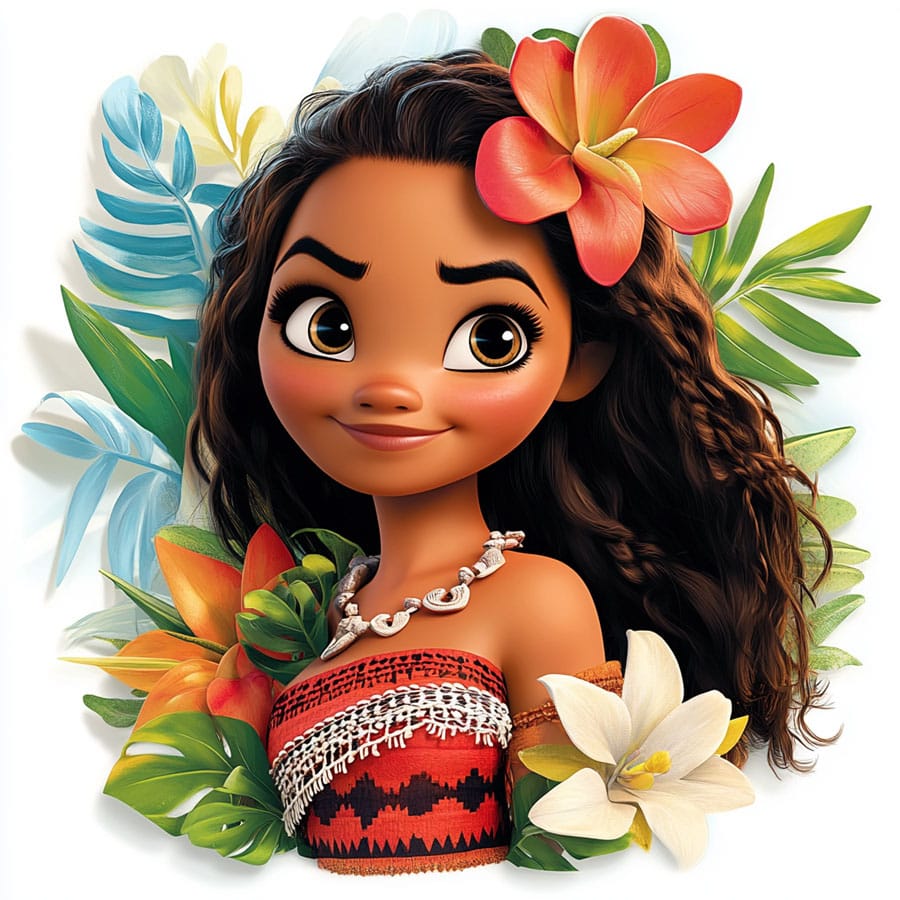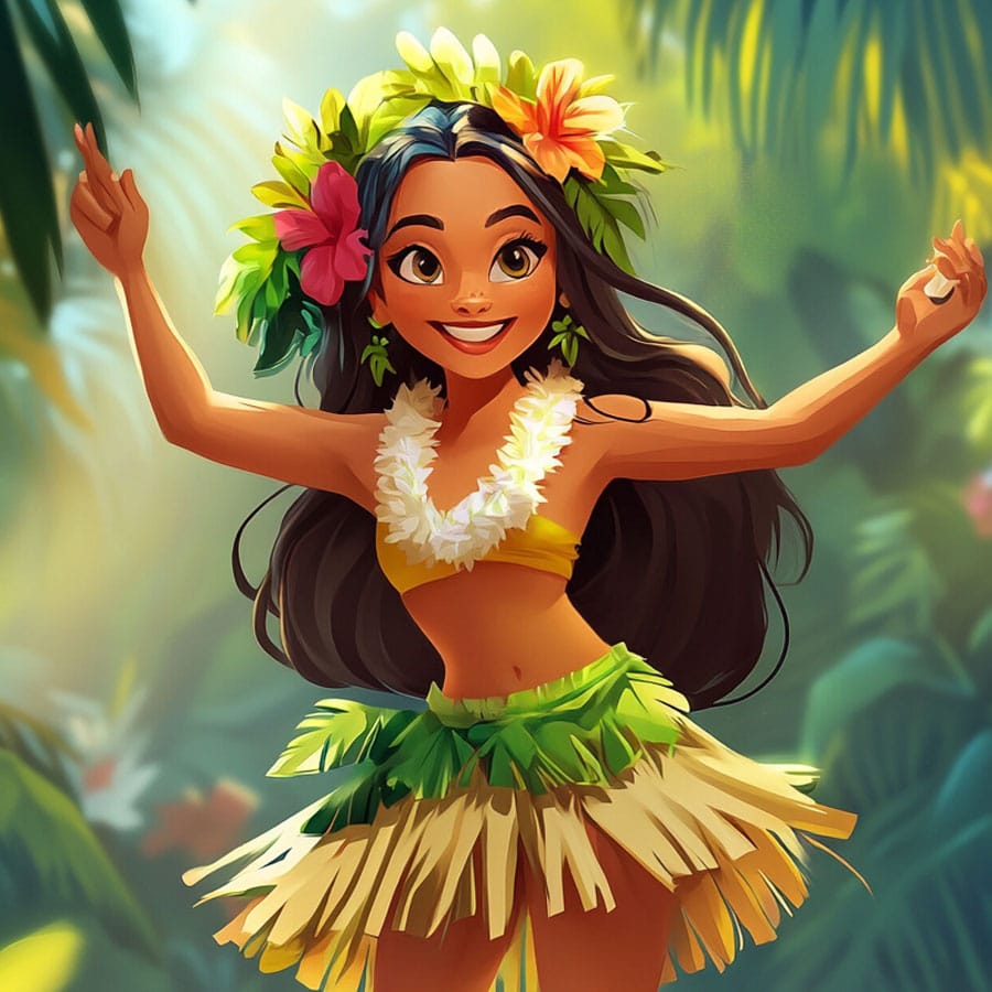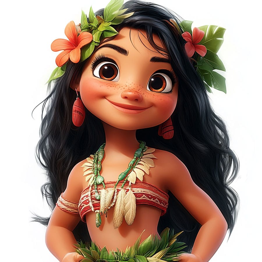 Este dibujo captura la esencia de esos momentos perfectos de la infancia: pura diversión y conexión con la naturaleza. La niña podría estar en una pequeña isla tropical, disfrutando del viento en su rostro mientras se columpia entre las hojas de palmeras gigantes. Su rostro nos recuerda a tantos personajes de películas de television como Vaiana, o Lilo y Stich., Tal vez esté en medio de una celebración, con su corona de flores que representa alegría, amistad y una bienvenida cálida al mundo que la rodea.
