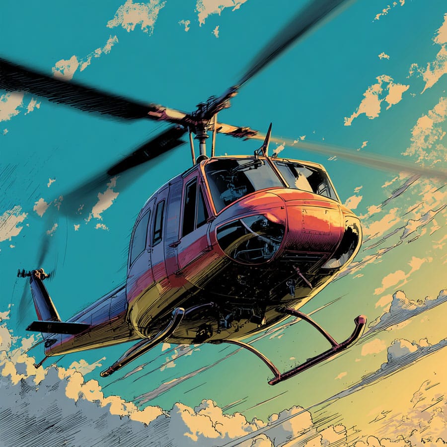 Cuando vayas a colorear, intenta hacerlo con trazos firmes y en la misma dirección. Si usas lápices de colores, prueba a presionar un poco más en las zonas que quieras sombrear. Por ejemplo, debajo del helicóptero o en los laterales que quedarían en sombra. Eso hará que parezca más tridimensional, como si estuviera a punto de despegar.