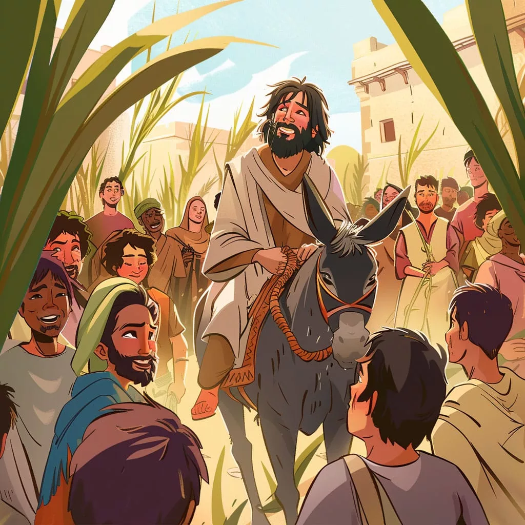 El Domingo de Ramos es un día muy especial para los cristianos. Marca el inicio de la Semana Santa y recuerda el día en que Jesús entró a Jerusalén montado en un burro, en lo que se llama la Entrada Triunfal de Jesús en Jerusalén. La gente estaba muy feliz de verlo y extendió hojas de palma en el camino para darle la bienvenida.