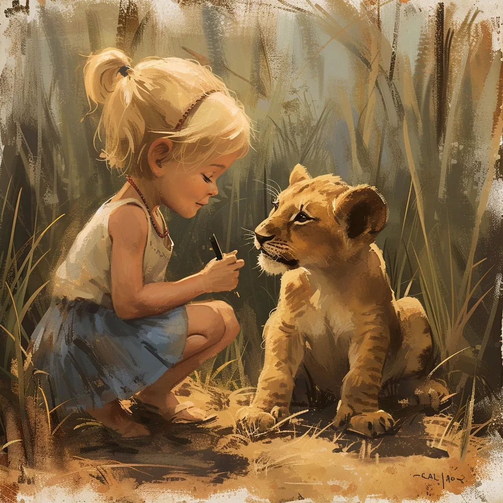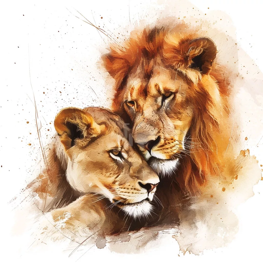 Entorno: Dado que están cazando, probablemente estén en una sabana o un entorno similar. Usa verdes apagados, amarillos y ocres para el fondo, creando una sensación de amplitud y vida silvestre.