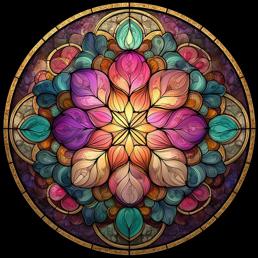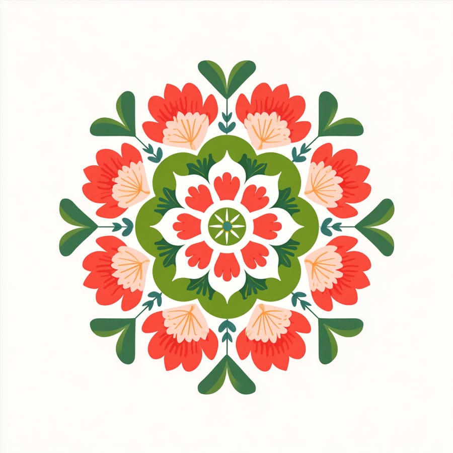 Este mandala floral con corazones es una imagen de gran riqueza simbólica. Su estructura radial y simétrica sugiere equilibrio y unidad. El centro está dominado por una flor con pétalos redondeados, rodeada por corazones, elementos vegetales y flores adicionales. La disposición no es aleatoria: cada forma ha sido colocada para que mantenga la armonía visual, provocando una sensación de calma.