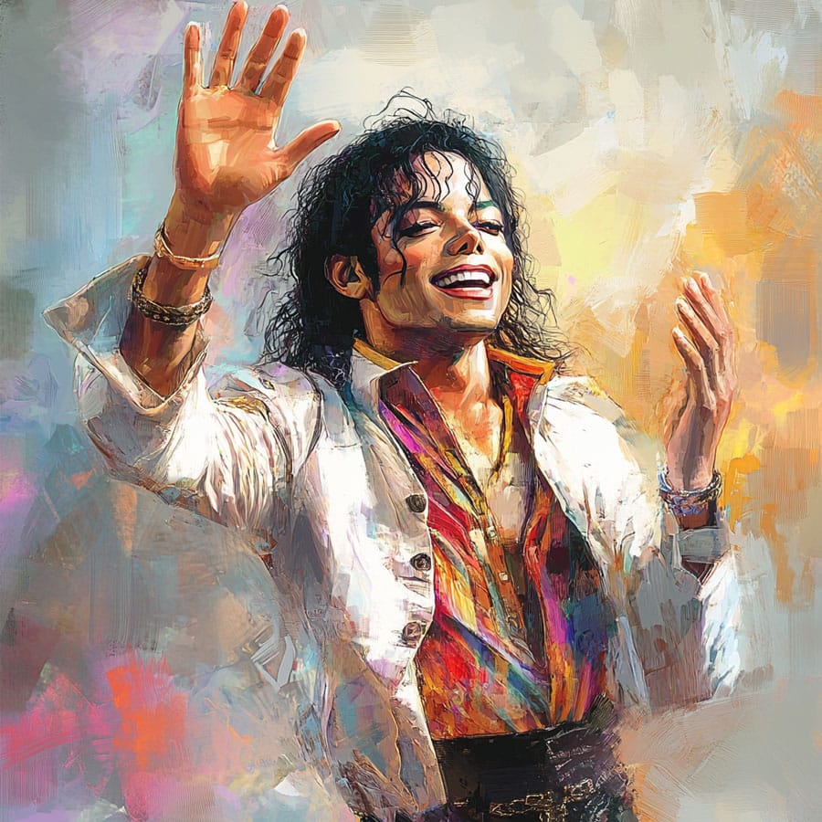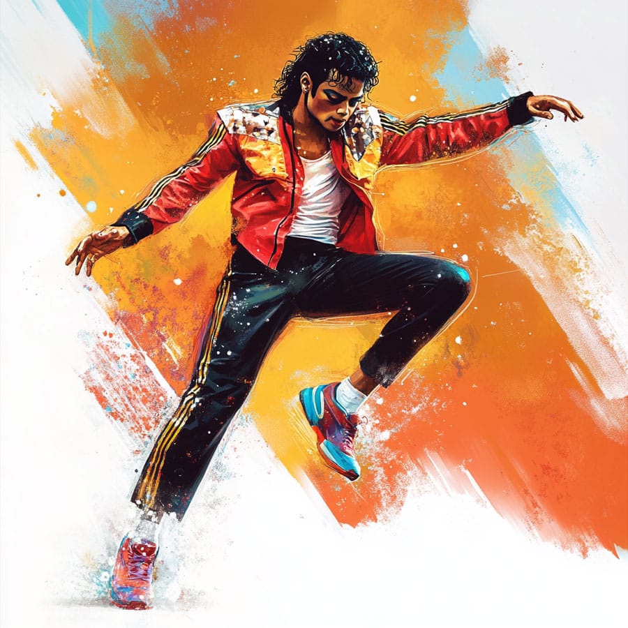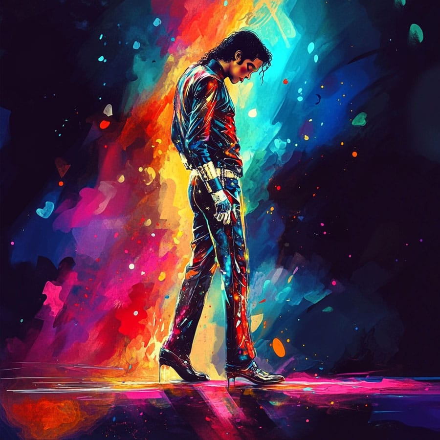El fondo es una excelente oportunidad para experimentar con luces brillantes o destellos de colores vibrantes, como si Michael Jackson estuviera bajo los reflectores de un escenario. Puedes crear un efecto de iluminación al difuminar colores más claros alrededor de la figura, dándole un toque teatral y destacando aún más su pose dramática.