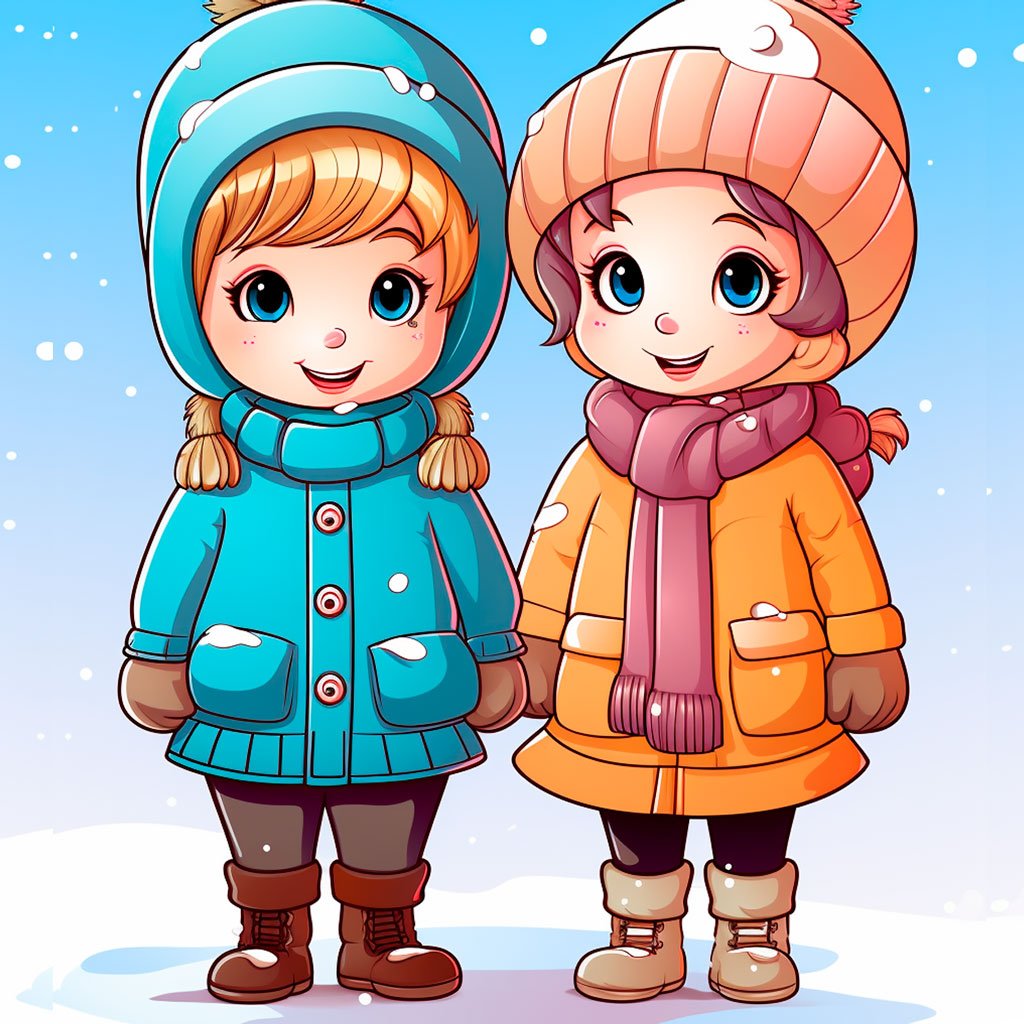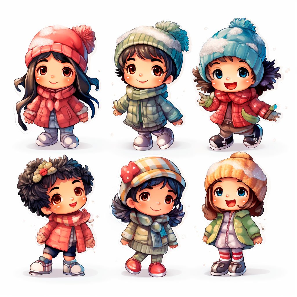 Ropa de Invierno: Colorea los abrigos, bufandas, gorros y guantes de los niños con patrones a rayas o con estampados navideños como copos de nieve o renos.