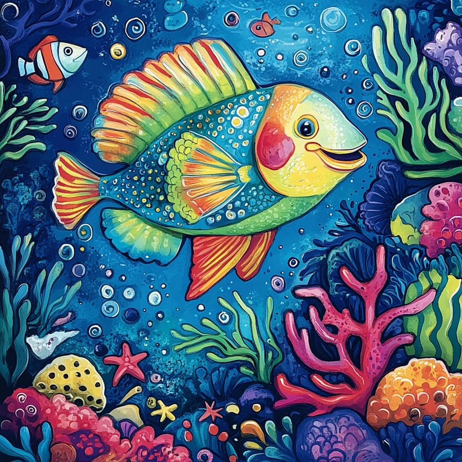 El mar es un ecosistema complejo y fascinante donde cada organismo tiene un papel importante. Este dibujo representa un pez caricaturesco, lo cual lo hace accesible y atractivo para niños, pero detrás de este simpático dibujo hay una oportunidad de aprendizaje profundo. Los peces suelen verse afectados por problemas creados por los seres humanos, como los microplásticos, que se producen por el uso excesivo de plástico en nuestra vida diaria.