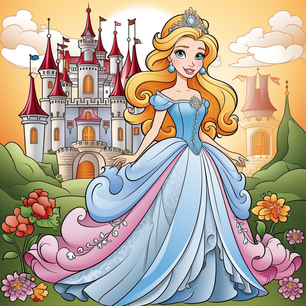 - La princesa: ¿Qué color de vestido y cabello imaginas para nuestra princesa? Puedes dejar volar tu imaginación. Si decides que su vestido sea rosa, puedes añadir detalles como joyas o adornos dorados. Para el cabello, puedes usar tonos rubios, castaños o negros, y no olvides agregar brillo y movimiento con algunos trazos más claros.