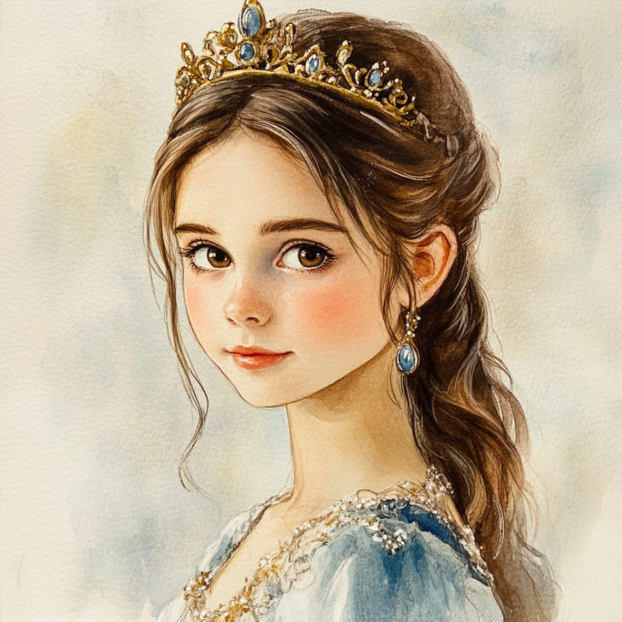 Además, presta atención al rostro de la princesa. Sus ojos grandes y expresivos pueden destacar con colores suaves y sombras delicadas. Su expresión serena invita a imaginar su historia: ¿Está en un jardín esperando una ceremonia? ¿Qué emociones transmite su postura?