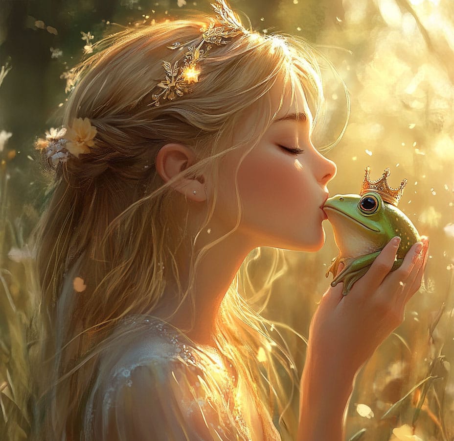 Esta imagen evoca uno de los temas clásicos en los cuentos de hadas: la relación entre una princesa y un sapo. Inspirada en historias como “El príncipe rana” de los hermanos Grimm, «Tiana y el Sapo» esta escena representa el momento en el que la princesa, a pesar de su sorpresa o duda, contempla al sapo, que resulta ser un príncipe encantado. Estos cuentos suelen enseñar valores como la importancia de mirar más allá de las apariencias y valorar la bondad y el corazón de las personas.
