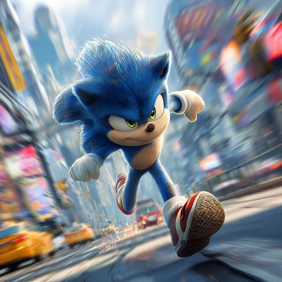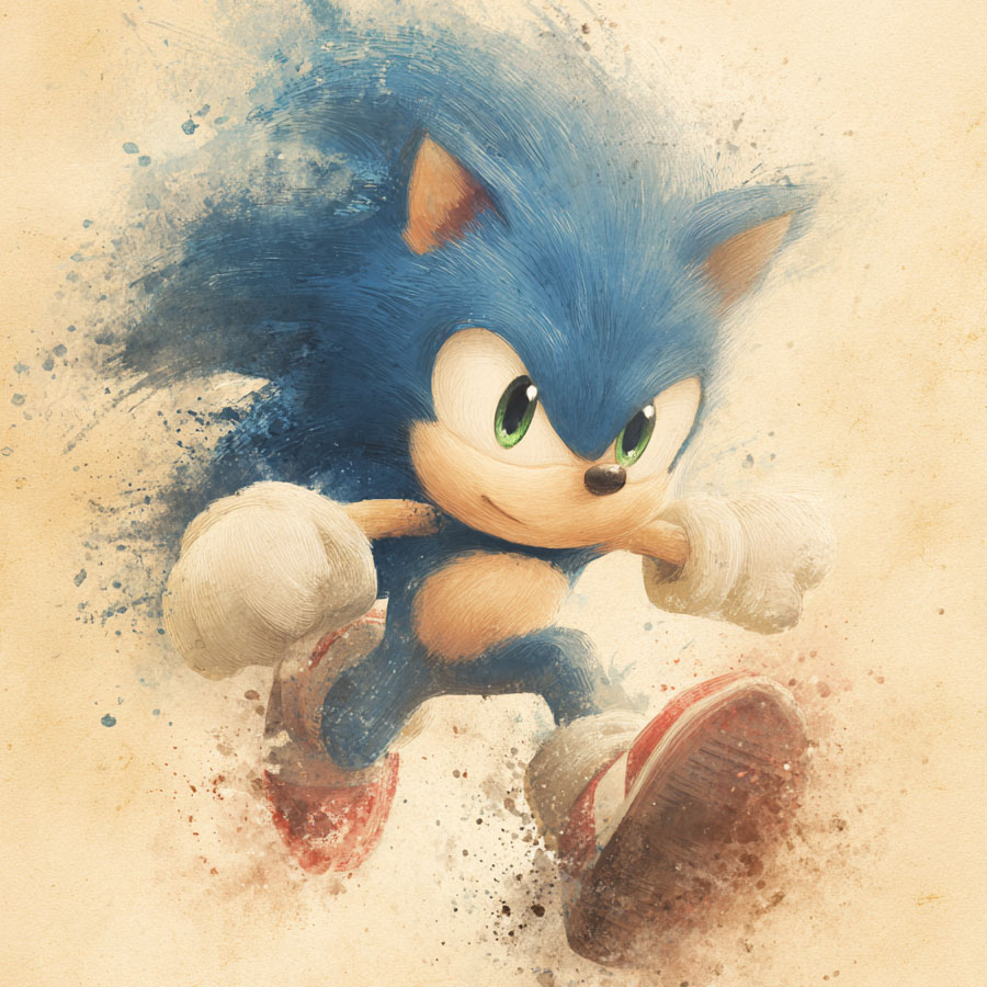 En este dibujo vemos a Sonic en plena acción, atravesando un anillo brillante que parece un portal mágico. Fíjate en su expresión decidida y en la postura de sus brazos y piernas: transmiten una velocidad arrolladora, como si nada pudiera detenerlo en su aventura.