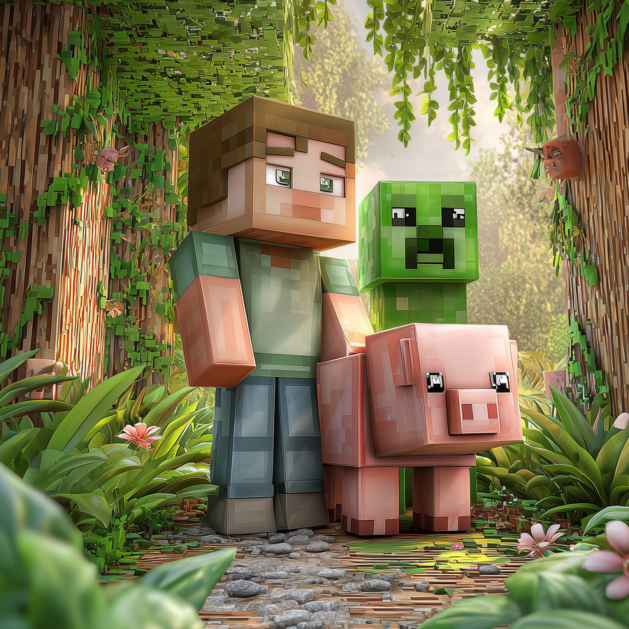 En el mundo de Minecraft, cada bloque es una oportunidad para crear. Este dibujo para colorear muestra a Steve, fiel a su espada, junto a un cerdito y un pollito, listos para nuevas aventuras. Ahora es tu turno de darles vida con colores, texturas y sombras. Imagina un día soleado en la pradera o una tarde con cielos anaranjados al atardecer.